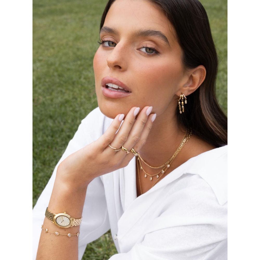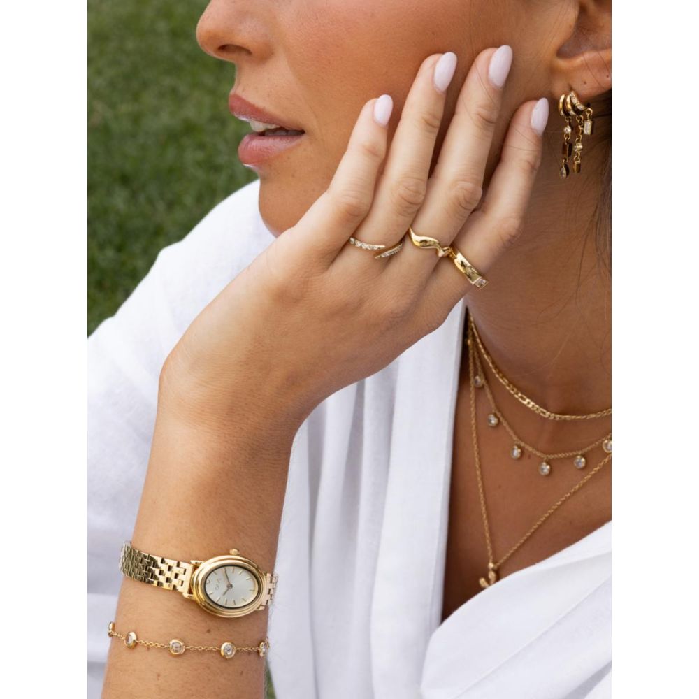 A bracelete de elos em aço inoxidável dourado confere sofisticação, enquanto o mostrador de fundo dourado, com duas circunferências subtis, cria uma composição visual harmoniosa e distinta.