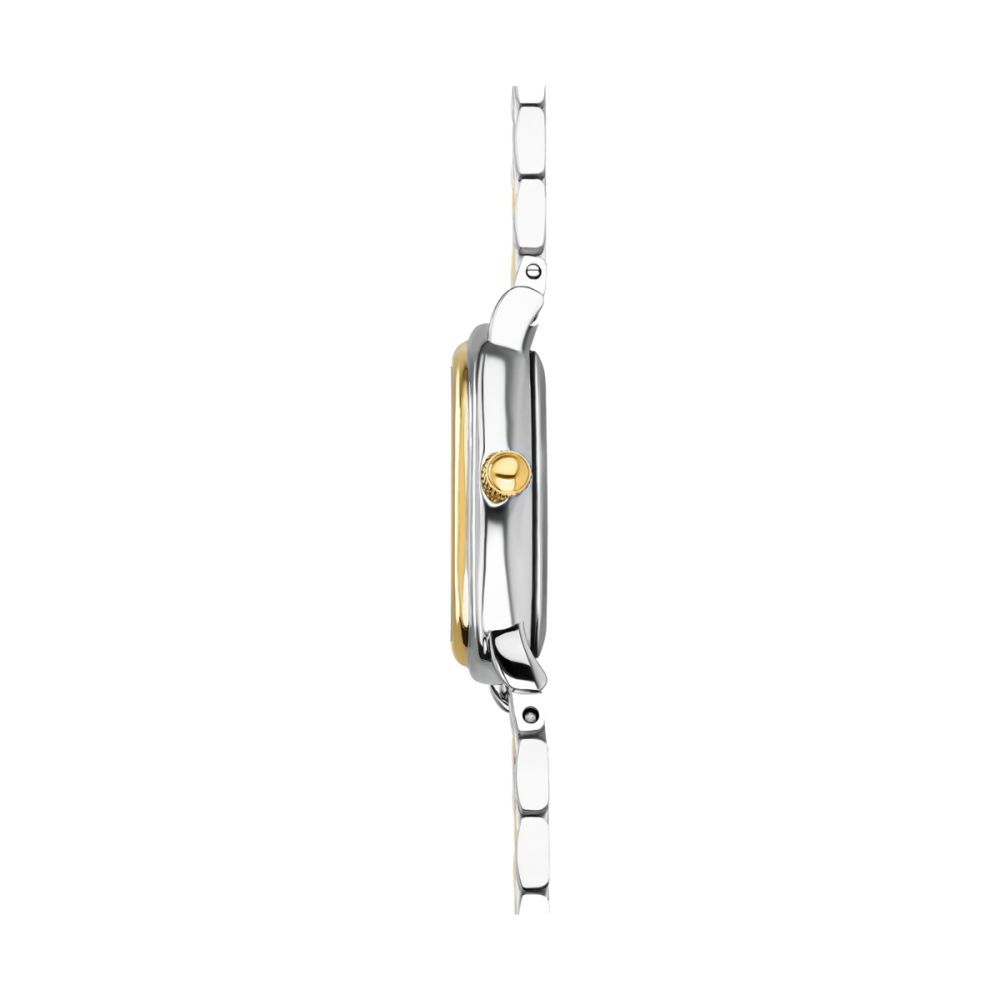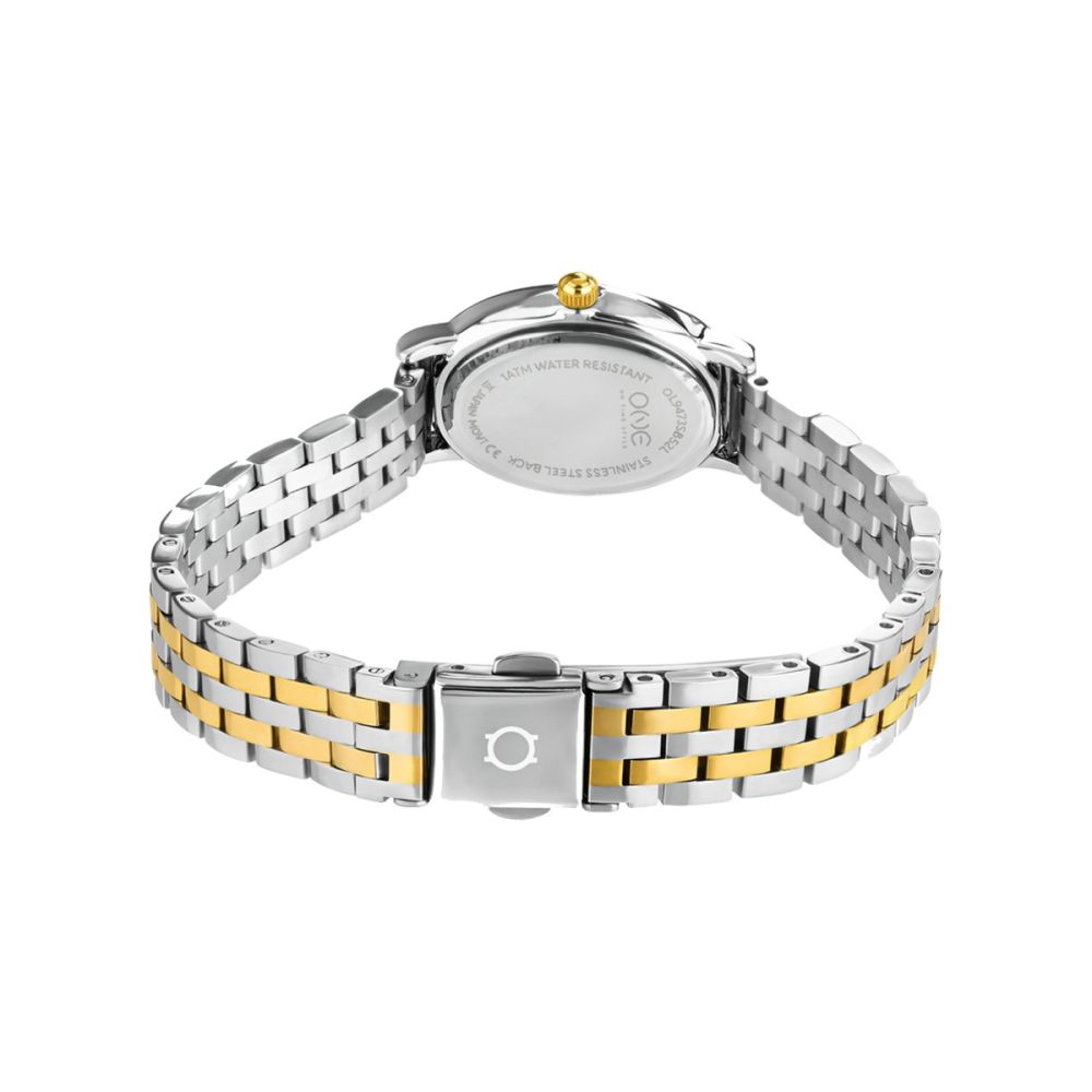 O relógio Flirt destaca-se pela sua elegância contemporânea e pelo equilíbrio subtil entre o dourado e o prateado. A bracelete em aço bicolor, com elos que combinam os dois tons, oferece um visual sofisticado e versátil, perfeito para quem gosta de peças com personalidade. No mostrador, duas circunferências, uma dourada e outra prateada, criam profundidade e contraste, destacando-se sobre o fundo claro. Os ponteiros dourados e os marcadores de horas em traços mantêm a linha minimalista, enquanto o cristal zircónia branco posicionado no topo do mostrador, acima da inscrição One, acrescenta um toque de brilho discreto. O Flirt é mais do que um relógio: é uma declaração de estilo, pensado para quem gosta de ousar com classe e leveza, em qualquer ocasião.