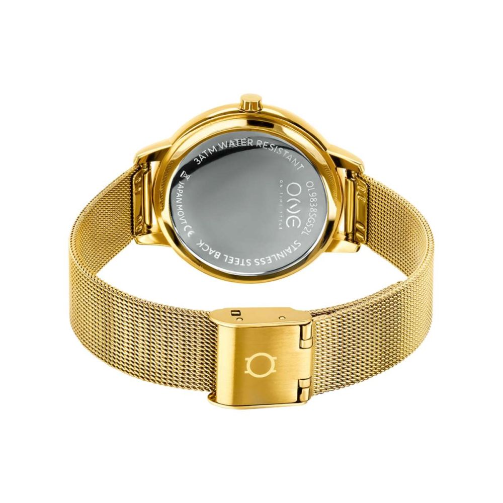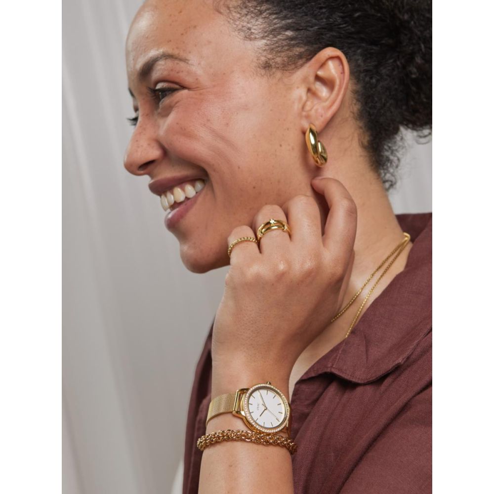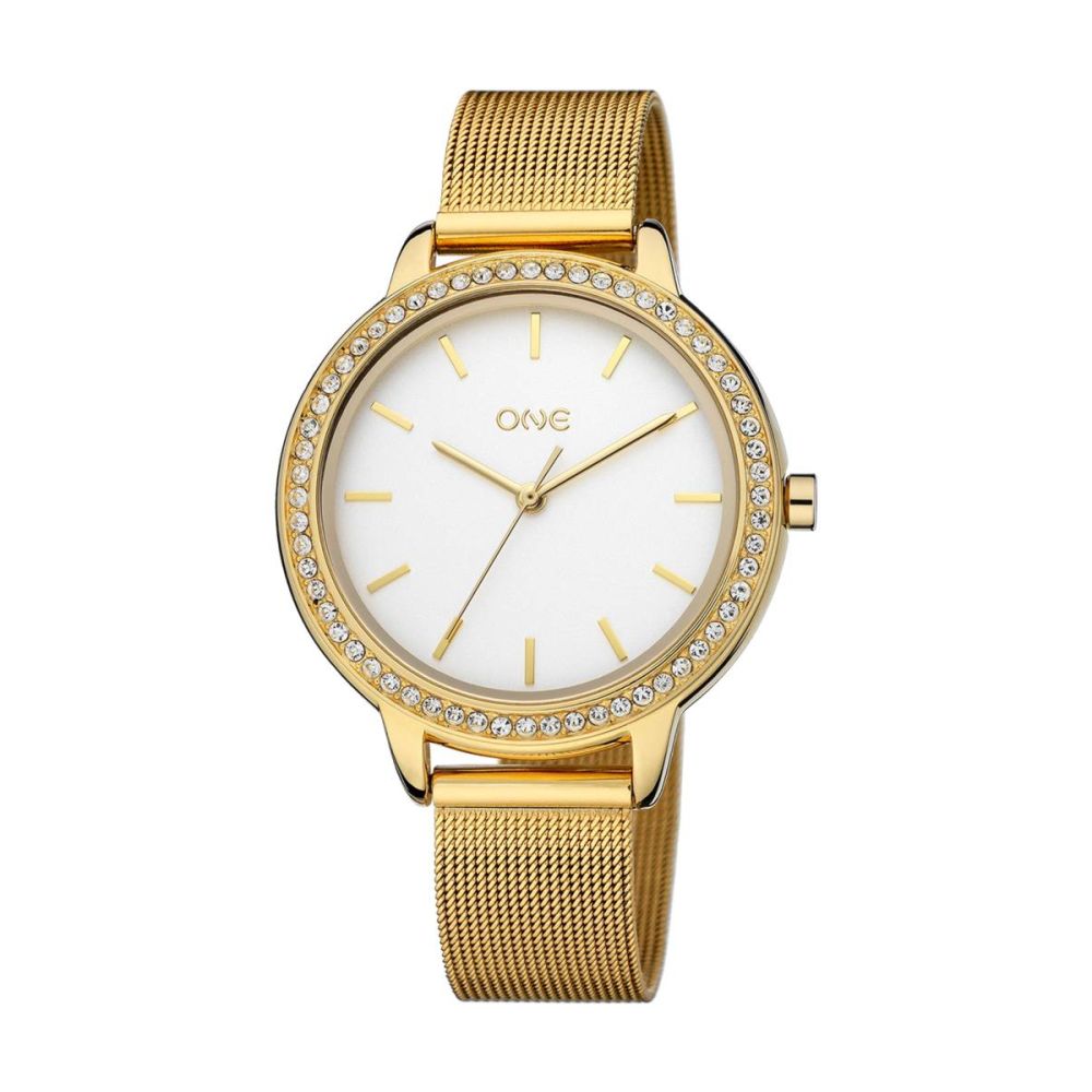 Este modelo segue a tendência de caixas mais pequenas, em dourado e redondas. O seu mostrador tem um fundo em branco, que lhe confere um toque mais romântico, e que é complementado pelos indexes finos em dourado. Conta ainda com um toque de glamour e luminosidade extra graças aos cristais brancos cravados na cabeça do relógio em torno do mostrador. Com uma fina bracelete em mesh igualmente dourada, que se ajusta facilmente a qualquer pulso graças ao fecho de ajuste rápido.