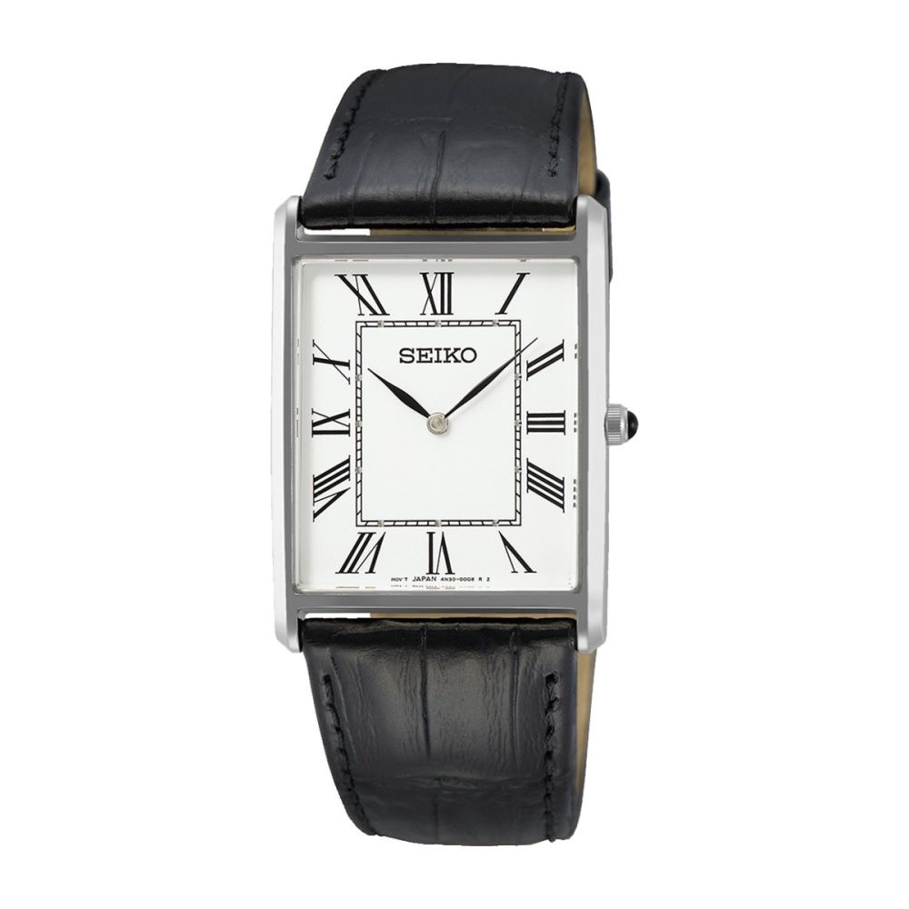 Um relógio de quartzo verdadeiramente clássico, com caixa retangular prateada e numeração romana. Simples e elegante, com mostrador branco e bracelete em pele preta, este relógio de 2 ponteiros alimentados pelo calibre 4N30 oferece a precisão do quartzo e um estilo intemporal.