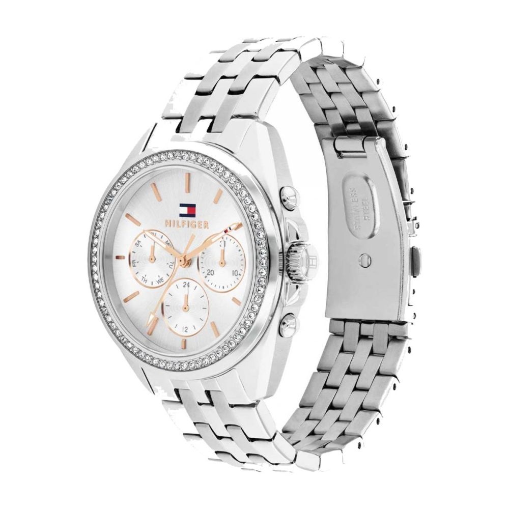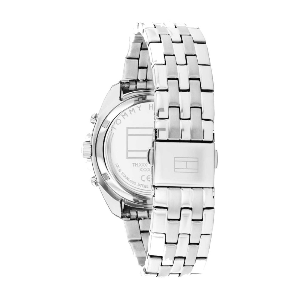 Relógio Tommy Hilfiger Mellie 1782802. Caixa com diâmetro aproximado de 36 mm, cor prateada, bracelete cor prateada e mostrador cor preteado. Está equipado com um movimento quartzo. O relógio é estanque até 50 m | 5 bar | 5 atm. Composição: aço.