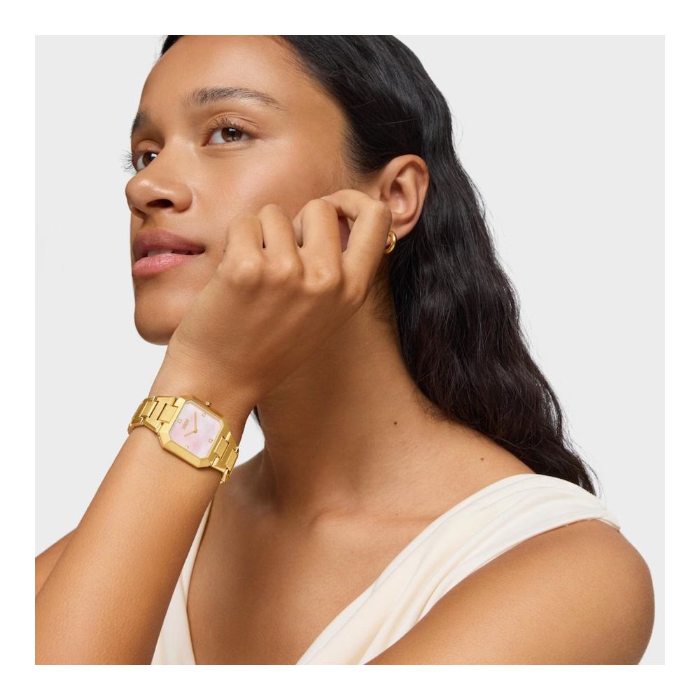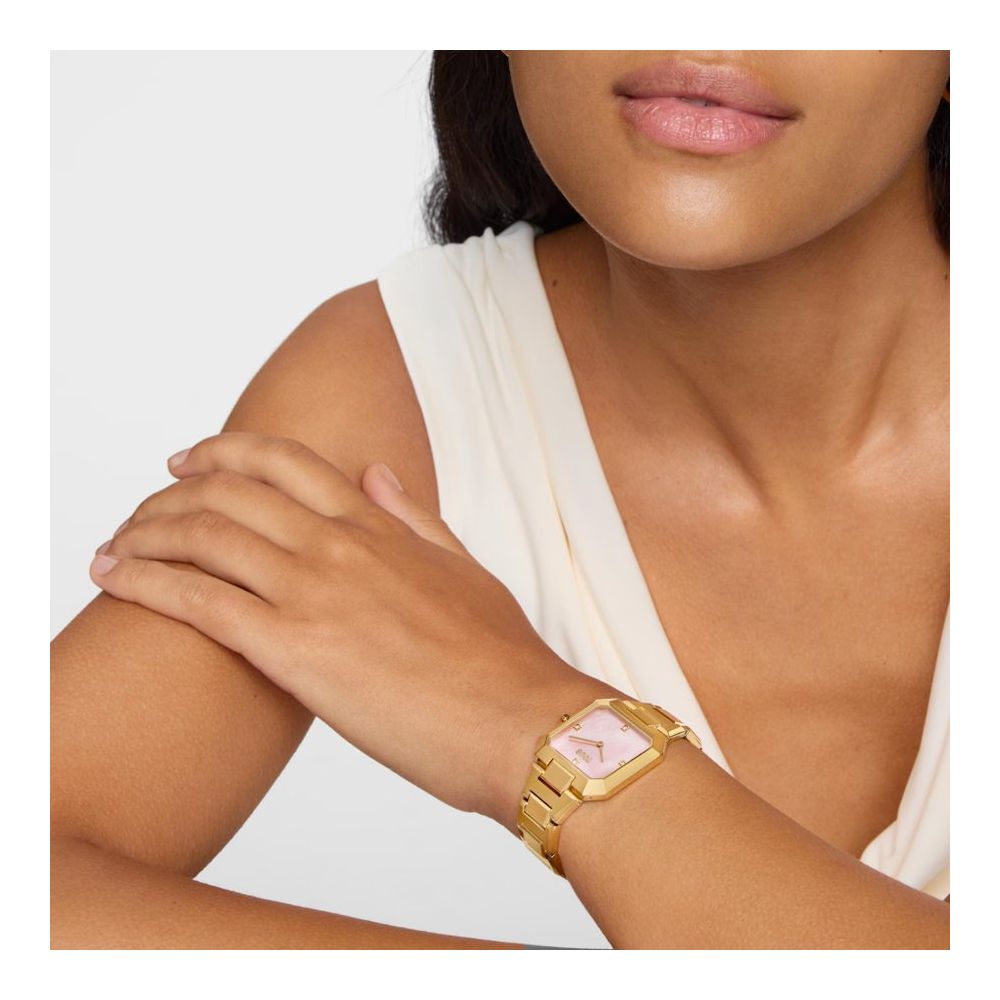 Mostrador em madrepérola na cor rosa com cristais facetados nos marcadores das horas.