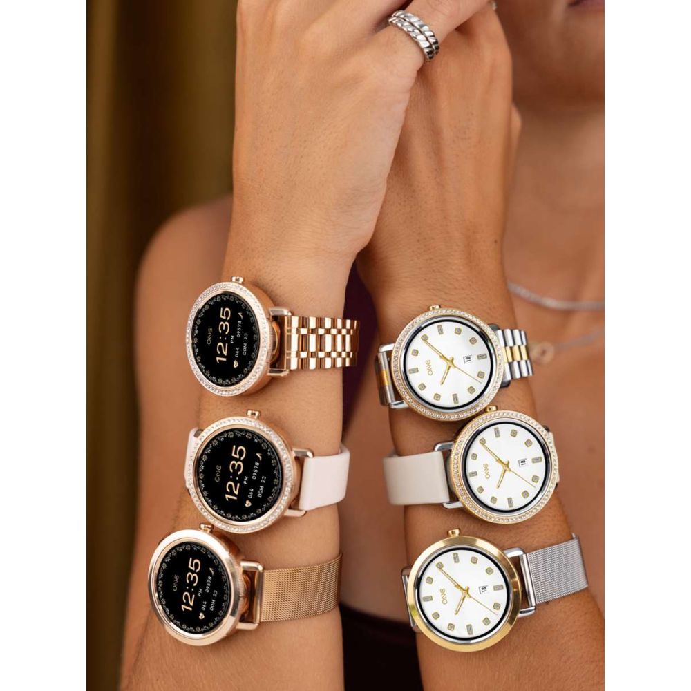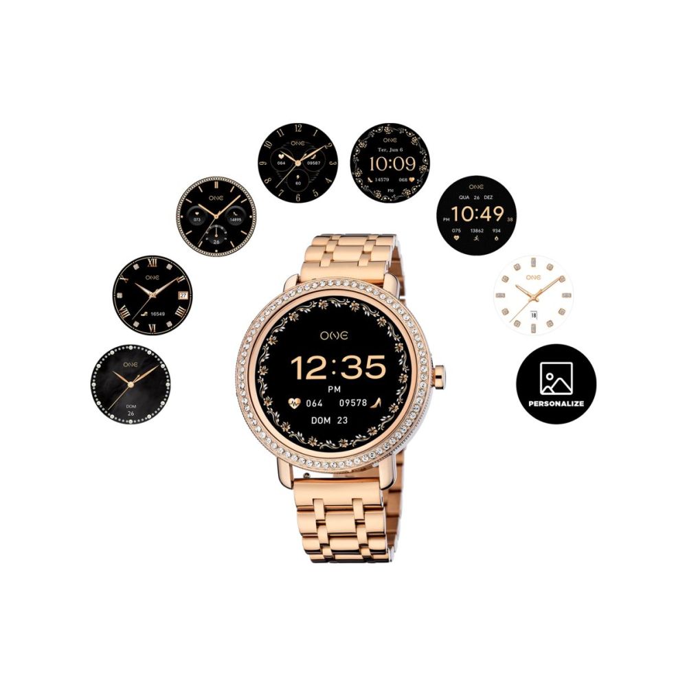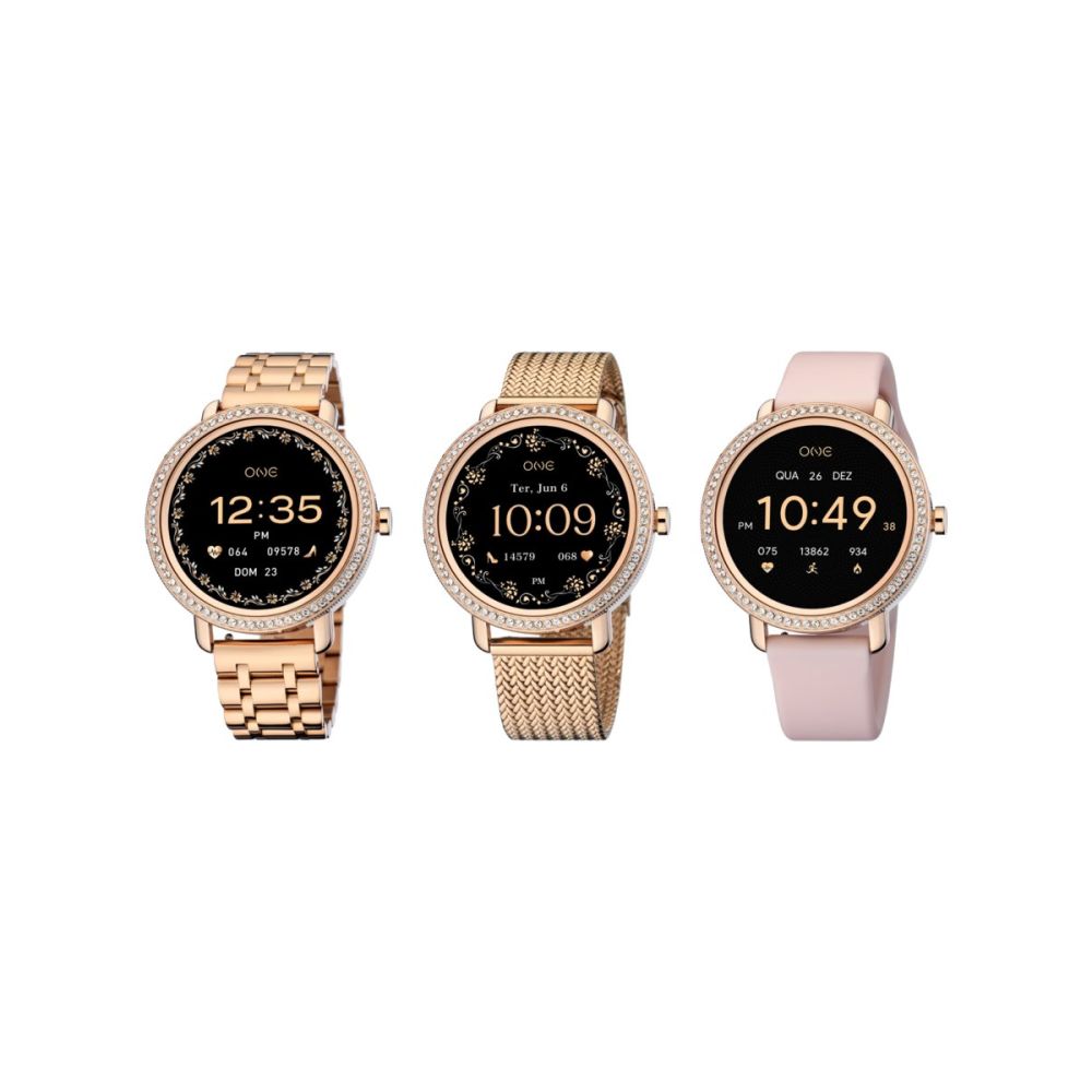 Este conjunto inclui três braceletes intercambiáveis que permitem transformar o smartwatch Mini Spark em segundos: uma bracelete em elos rosa dourado, clássica e elegante, uma bracelete em mesh também em rosa dourado e uma bracelete em silicone rosa claro, prática e confortável para o dia-a-dia. Além das braceletes, a box traz ainda dois aros distintos para personalizar o mostrador: um aro em rosa dourado com cristais zircónicas brancas, que acrescenta brilho e glamour e um aro liso em rosa dourado para um visual mais discreto e minimalista. O ecrã AMOLED oferece uma experiência visual mais nítida e envolvente, enquanto o mostrador totalmente personalizável disponibiliza 8 designs exclusivos com ADN One ou a possibilidade de usares qualquer imagem da galeria do teu telemóvel para um toque único e pessoal.