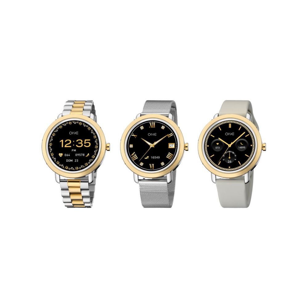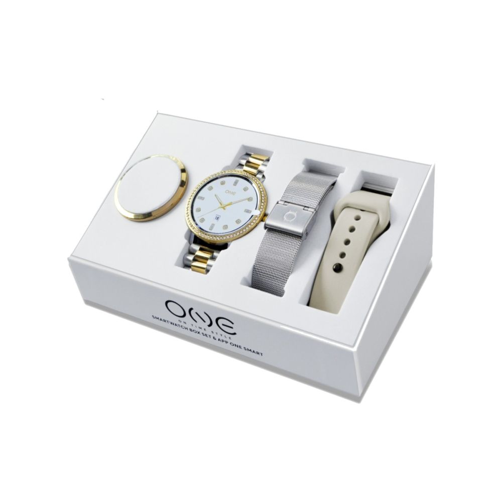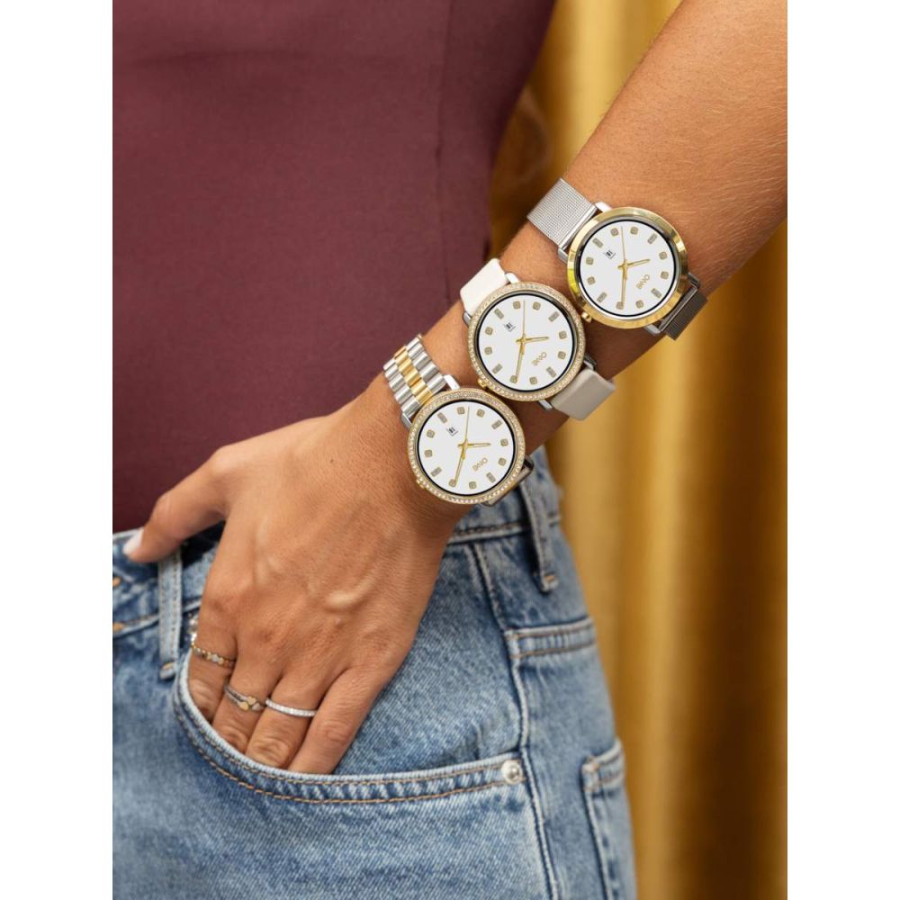 A box inclui três braceletes intercambiáveis que permitem transformar o smartwatch em segundos: uma bracelete em elos metálicos bicolor, elegante e moderna, uma bracelete em mesh e uma bracelete em silicone bege, prática e confortável para qualquer ocasião.