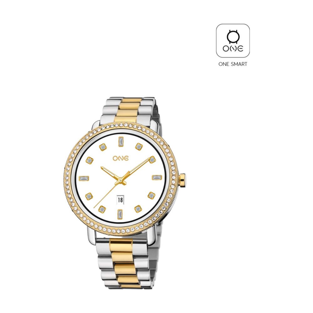 Está equipado com um movimento smartwatch. O relógio é estanque até 10 m | 1 bar | 1 atm. Composição: aço, silicone e cristais zirconia