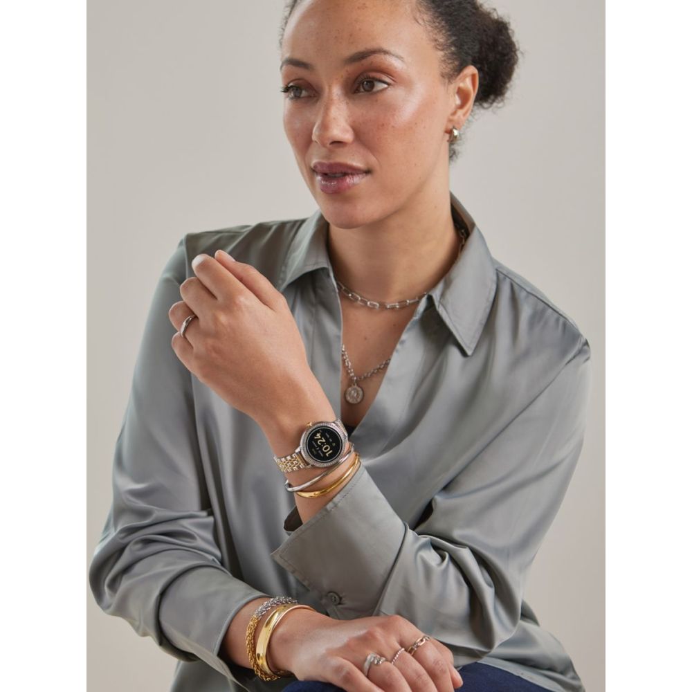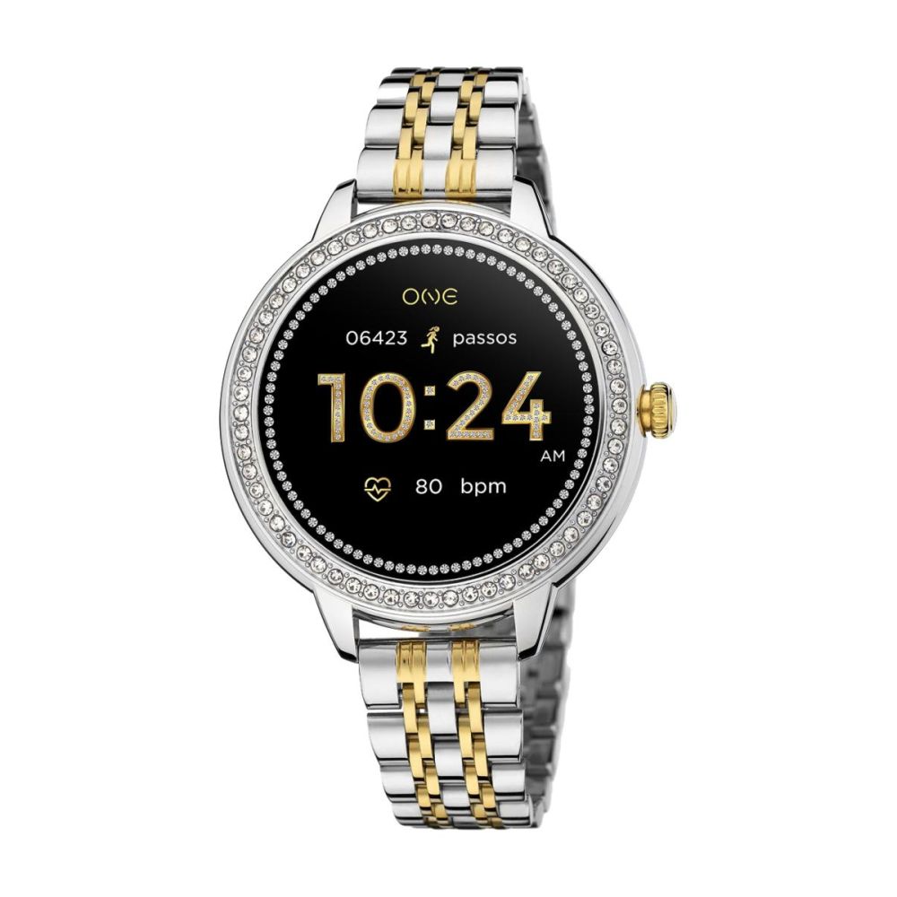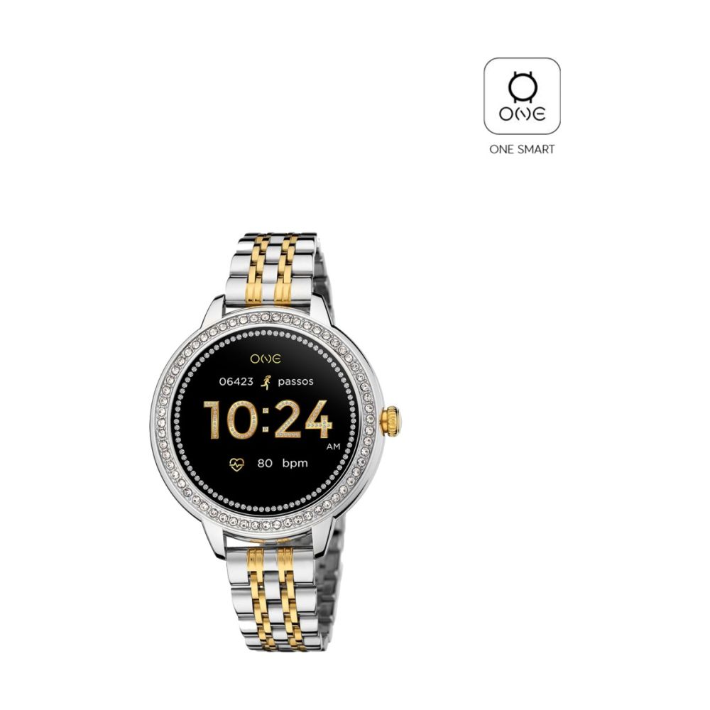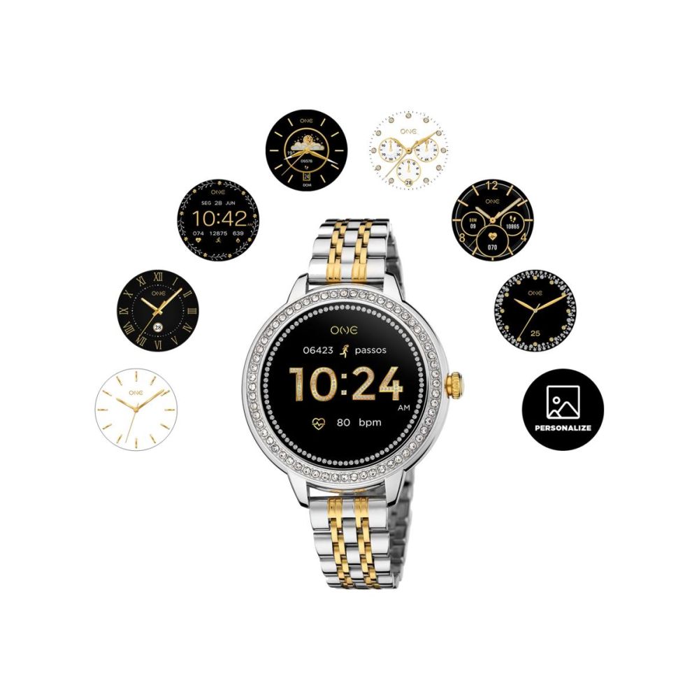 O mostrador redondo prateado com detalhe em cristais zircónias brancas combina na perfeição com a bracelete de elos metálicos bicolor, reforçando o caráter urbano e feminino desta peça única. Equipado com ecrã AMOLED, oferece uma experiência visual mais nítida, brilhante e envolvente. O mostrador é totalmente personalizável com 8 designs exclusivos com ADN One, ou, se preferires, podes usar qualquer imagem da galeria do teu telemóvel para um toque ainda mais pessoal.